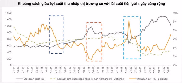 "Tuy nhiên, để định giá thị trường Việt Nam trong tương quan với môi trường lãi suất tăng, chúng tôi sử dụng phương pháp định giá lợi suất thu nhập thị trường. Phương pháp này rất hữu ích khi xuất hiện lo ngại về lãi suất tăng và giúp nhà đầu tư tối ưu phân bổ tài sản. Chúng tôi quan sát thấy rằng chênh lệch giữa lợi suất thu nhập của thị trường Việt Nam và lãi suất huy động bình quân 12 tháng của các ngân hàng thương mại đang gia tăng, điều này cho thấy thị trường chứng khoán có thể đang bị định giá thấp", phía VNDirect cho hay.