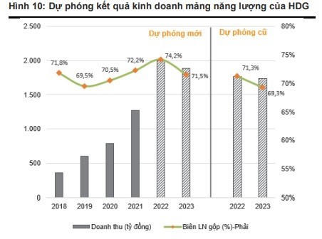 Theo đó, VNDirect dự phóng doanh thu mảng năng lượng của Hà Đô năm 2022 là 13,1%, năm 2023 là 8,7% lên lần lượt là 1.997 và 1.886 tỷ đồng so với cùng kỳ phản ánh cả sản lượng và giá bán điện cao hơn. Doanh thu cao hơn cũng sẽ giúp cải thiện biên lợi nhuận gộp năm 2022-2023 lên 74,2%/71,5%, cao hơn 2,9/2,2 điểm % so với dự phóng trước đó.