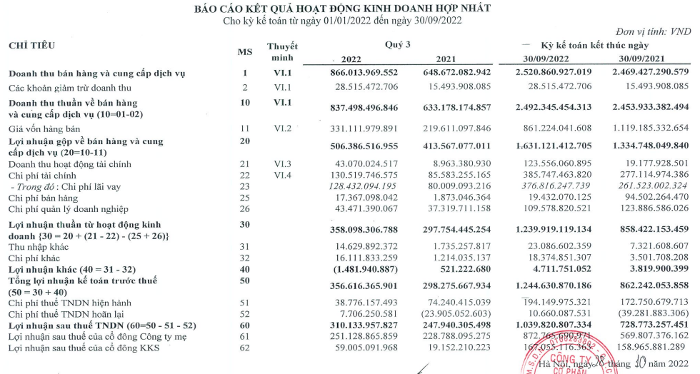 Trong khi đó, doanh thu mảng bất động sản (BĐS) lại giảm 41,5% so với cùng kỳ, do trong kỳ chỉ bàn giao 15 căn hộ tại dự án Charm Villas so với mức cao của cùng kỳ năm trước (khi ghi nhận doanh thu từ Hado Centrosa). Lũy kế 9 tháng năm 2022, doanh thu của công ty tăng nhẹ 2,1% so với cùng kỳ lên 2.521 tỷ đồng và lợi nhuận ròng bứt phá 53,2% so với cùng kỳ lên 873 tỷ đồng, hoàn thành 70% dự phóng cả năm.