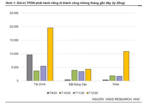 Theo Báo cáo thị trường trái phiếu doanh nghiệp của Công ty chứng khoán VNDIRECT, trong tháng 12/2020, có 35 doanh nghiệp phát hành riêng lẻ 34.470 tỷ đồng trái phiếu, tương ứng giá trị phát hành giảm 19,8% so với tháng 11 (số liệu điều chỉnh).