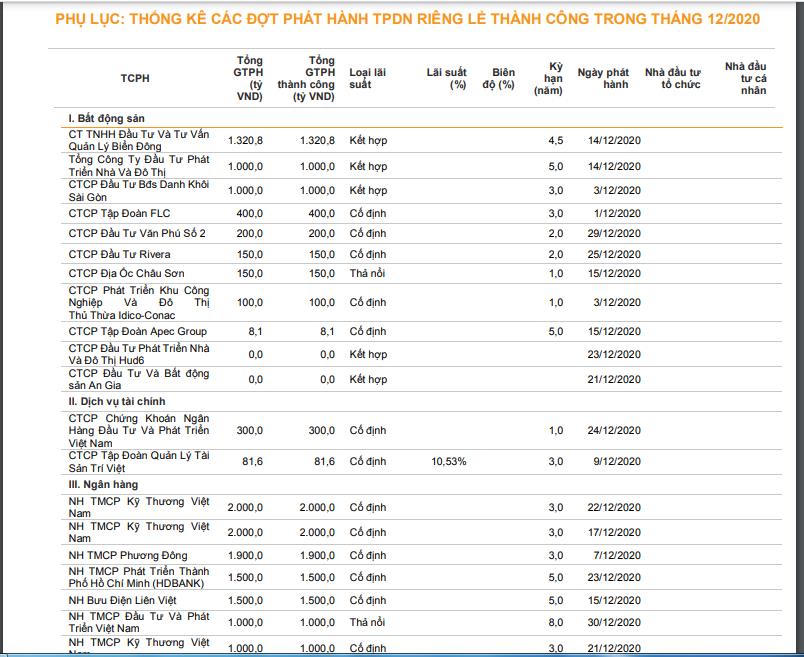 Tỷ lệ phát hành thành công đạt 45,7%. Những doanh nghiệp có giá trị phát hành trái phiếu riêng lẻ lớn nhất trong tháng 12 là NH TMCP Kỹ Thương Việt Nam (5.000 tỷ đồng), NH TMCP Phương Đông (3.900 tỷ đồng) và NH TMCP Tiên Phong (3.200 tỷ đồng).