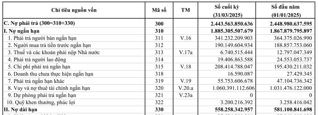 Nợ phải trả của VNECO tính đến ngày 31/3/2025 là hơn 2.443,56 tỷ đồng. tập trung chủ yếu ở nợ ngắn hạn hơn 1.885,30 tỷ đồng, chiếm 77,1% nợ phải trả công ty.