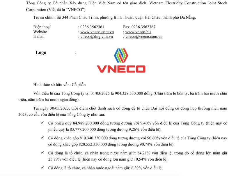 Tổng công ty cổ phần Xây dựng điện Việt Nam (VNECO) được thành lập ngày 11/10/2005 của Bộ trưởng Bộ Công nghiệp về việc phê duyệt phương án và chuyển Công ty Xây lắp Điện 3 thành Tổng công ty cổ phần Xây dựng điện Việt Nam (gọi tắt VNECO). Trụ sở chính tại số 344 Phan Châu Trinh, phường Bình Thuận, quận Hải Châu, TP Đà Nẵng.