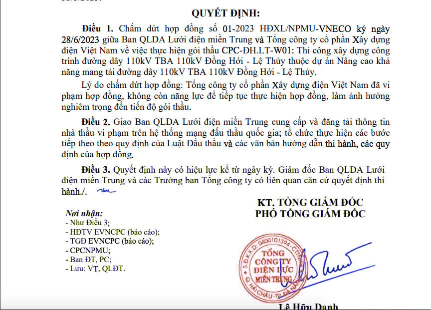 Theo quyết định, Tổng công ty Điện lực miền Trung chấm dứt hợp đồng số 01-2023 HĐXL/NPMU-VNECO ký ngày 28/6/2023, giữa Ban QLDA Lưới điện miền Trung và Tổng công ty cổ phần Xây dựng điện Việt Nam về việc thực hiện Gói thầu CPC-ĐH.LT-W01: Thi công xây dựng công trình đường dây 110kV TBA 100kV Đồng Hới – Lệ Thuỷ, thuộc dự án Nâng cao khả năng mang tải đường dây 110kV TBA 110kV Đồng Hới – Lệ Thuỷ.