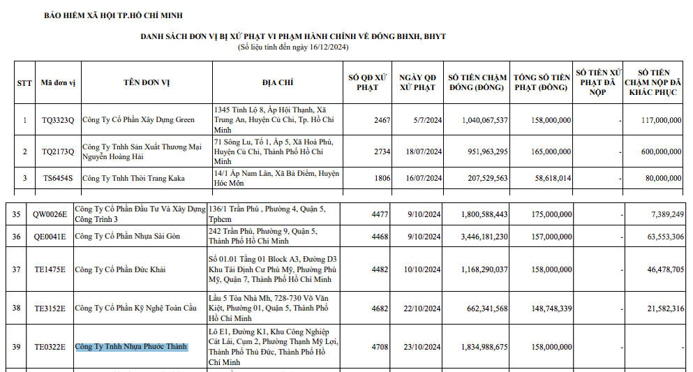 Bảo hiểm Xã hội (BHXH) TP. HCM vừa công khai danh sách các đơn vị bị xử phạt vi phạm hành chính về đóng bảo hiểm xã hội, bảo hiểm y tế (số liệu tính đến ngày 16/12/2024). Trong danh sách công khai có điểm mặt Công ty TNHH Nhựa Phước Thành, địa chỉ tại đường K1, Khu công nghiệp Cát Lái, cụm 2, phường Thạnh Mỹ Lợi, thành phố Thủ Đức, TP. HCM.
