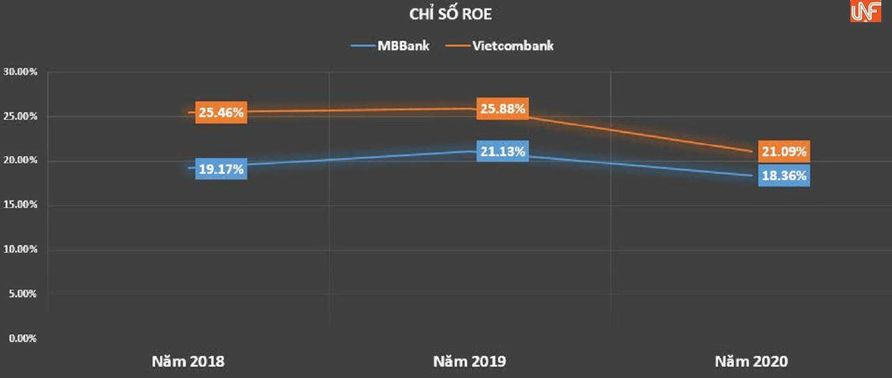 Ngược lại, chỉ số ROE tại MB lại thấp hơn Vietcombank, năm 2019 - 2020 đạt 21,13% và 18,36% trong khi Vietcombank đạt 25,88% và 21,09%. Song ROE tại hai nhà băng này cũng đã giảm mạnh.