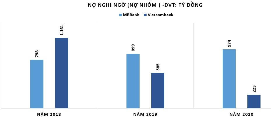 Cụ thể, tính đến 31/12/2020, nợ nhóm 3 (nợ dưới tiêu chuẩn) tại MB ghi nhận 889,7 tỷ đồng trong khi Vietcombank chỉ ở mức 668,6 tỷ đồng. Nợ nhóm 4 (nợ nghi ngờ) tại MB ghi nhận 973,5 tỷ đồng trong khi tại Vietcombank chỉ ghi nhận hơn 223 tỷ đồng.