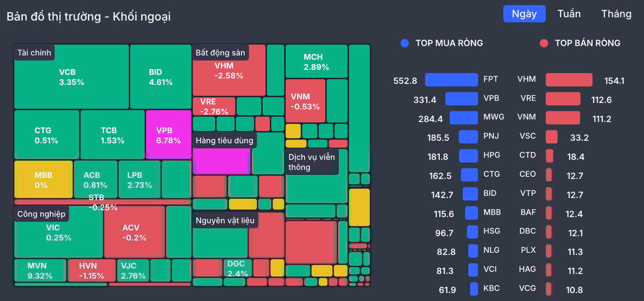 Điểm đáng chú ý nhất trong phiên là động thái của khối ngoại. Với tổng giá trị mua ròng gần 2.300 tỷ đồng – cao nhất kể từ đầu năm 2025 – nhà đầu tư nước ngoài đã đẩy mạnh gom hàng tại các cổ phiếu trụ như FPT (+540 tỷ đồng), VPB (+322 tỷ đồng), MWG (+284 tỷ đồng), HPG (+182 tỷ đồng)... Ở chiều bán ra, họ chủ yếu chốt lời tại VHM (-156 tỷ đồng), VRE (-114 tỷ đồng), VNM (-111 tỷ đồng).