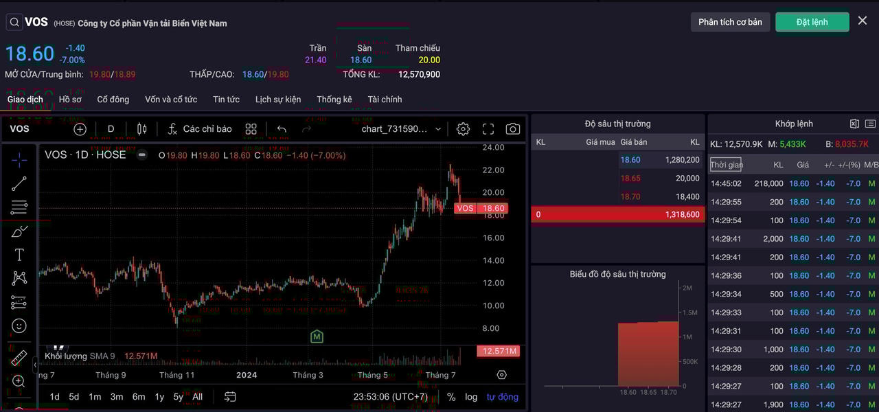 Cụ thể, trong phiên 16/7, cổ phiếu VOS đột ngột giảm hết biên độ mặc dù VN-Index không biến động quá mạnh. Sang phiên giao dịch 17/7, cổ phiếu VOS “đỏ lửa” ngay từ lúc mở cửa và đóng cửa trong tình trạng “múa bên trăng”.
