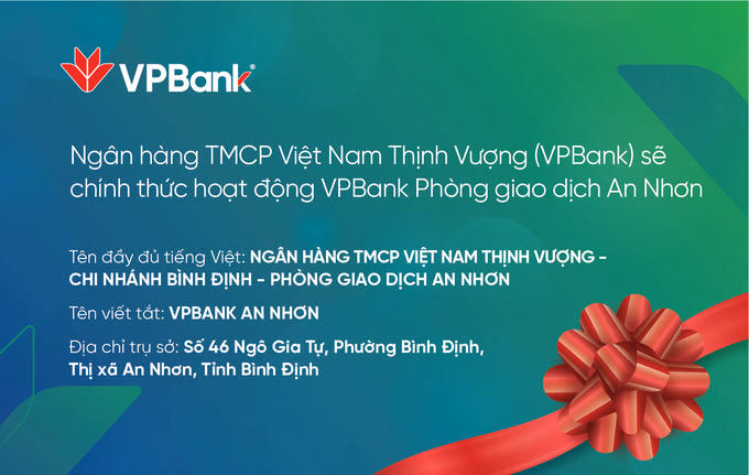 Ngân hàng TMCP Việt Nam Thịnh Vượng (VPBank) sẽ chính thức khai trương hoạt động của VPBank Phòng Giao Dịch An Nhơn trực thuộc Ngân hàng TMCP Việt Nam Thịnh Vượng – Chi nhánh Bình Định.