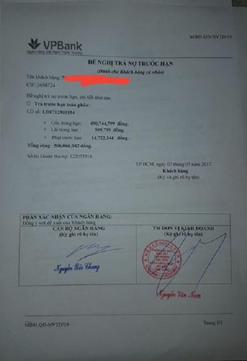 Sau khi giải ngân, gia đình anh C. thấy thông báo trả lãi của VPBank quá cao, lên tới 22%/năm nên gia đình anh yêu cầu tất toán khoản vay và đến ngày 7/7, gia đình anh nộp trả toàn bộ số tiền đã vay của ngân hàng VPBank.