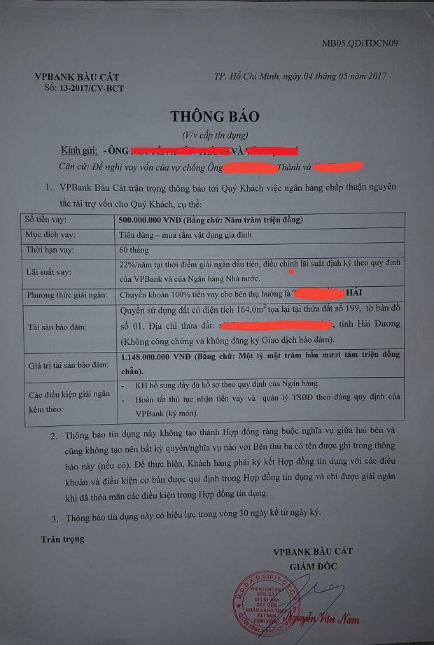 Thông báo cấp tín dụng cho gia đình anh C. của ngân hàng VPBank