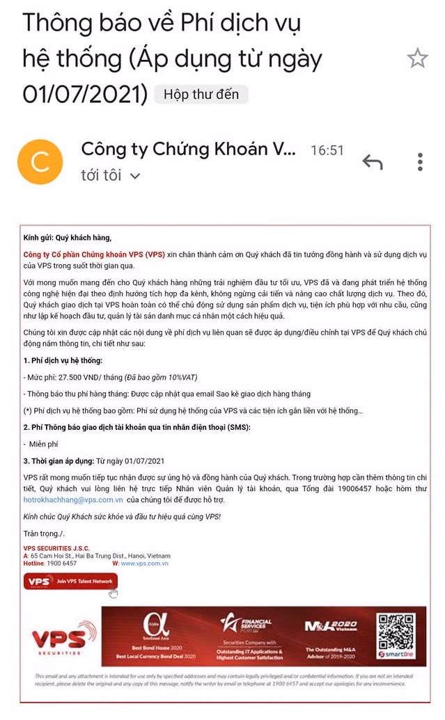 Trong ngày 14/6, trên các diễn đàn chứng khoán, nhà đầu tư đang tỏ ra khá bất bình với việc Công ty Chứng khoán (CTCK) VPS, từ 1/7/2021, CTCK này sẽ thu phí dịch vụ hệ thống 27.500 đồng/tháng (đã bao gồm VAT). Công ty cho biết đây là khoản phí dịch vụ hệ thống bao gồm phí sử dụng hệ thống của VPS và các tiện ích gắn liền với hệ thống.