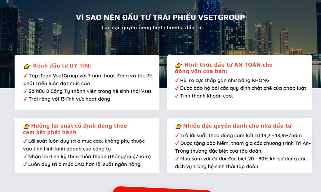 Thời điểm đó, lãnh đạo VsetGroup cho biết, việc phát hành trái phiếu doanh nghiệp là vì mục đích đi theo định hướng phát triển tương lai đến năm 2023 sẽ có thêm 3 công ty thành viên tham gia vào 3 lĩnh vực tài chính (Vset-Credit), giáo dục (Vset-Edu), Nông nghiệp – thực phẩm sạch (Vset-Eco).