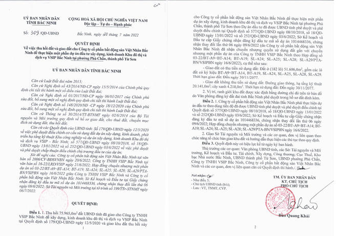Theo Quyết định 309/QĐ-UBND, Tổng diện tích thu hồi là 75.965 m2 đất UBND tỉnh đã giao Công ty TNHH VSIP Bắc Ninh để xây dựng, kinh doanh đô thị và dịch vụ VSIP Bắc Ninh tại quyết định 179/QĐ-UBND ngày 12/5/2020 và giao khu đất thu hồi này cho Công ty cổ phần bất động sản Việt Nhân Bắc Ninh để thực hiện một phần dự án xây dựng, kinh doanh khu đô thị và dịch vụ VSIP Bắc Ninh tại phường Phù Chẩn, thành phố Từ Sơn theo Dự án đầu tư đã được UBND tỉnh phê duyệt và phê duyệt điều chỉnh tại Quyết định số 577/QĐ-UBND ngày 08/10/2018, số 18/QĐ UBND ngày 13/01/2022 và số 252/QĐ-UBND ngày 03/6/2022; Sở Kế hoạch và Đầu tư cấp Giấy chứng nhận đăng ký đầu tư mã số dự án 1014468336, chứng nhận thay đổi lần thứ 06 ngày 09/6/2022.