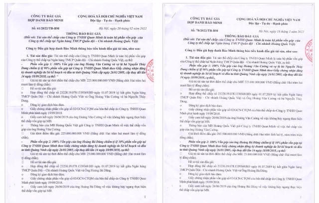 Cùng với đó, 100% vốn góp của ông Hoàng Bá Dũng tại Công ty Quan Minh (tương đương 10% vốn công ty) tương đương giá trị 25 tỷ đồng cũng được dùng làm tài sản thế chấp ngân hàng. Đến ngày 28/2/2022, Công ty đấu giá hợp danh Bảo Minh đã ra thông báo bán đấu giá các tài sản thế chấp này. Trong đó, giá khởi điểm đúng bằng giá tài sản tại thời điểm thế chấp cho MBBank lần lượt là 225 tỷ đồng với 90% vốn góp của ông Hoàng Văn Cường và vợ là bà Nguyễn Thùy Dung tại Công ty Quan Minh và 25 tỷ đồng với 10% vốn góp của ông Hoàng Bá Dũng tại công ty bất động sản này.
