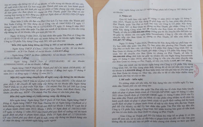 Thực hiện theo chỉ đạo, ngày 14/9/2023 UBND Quận Tân Phú có công văn về kết quả xác minh số tài khoản của công ty 585. Theo đó, 4 ngân hàng thông tin Công ty 585 có mở tài khoản. Trong đó, ACB- Văn Thánh có số dư hơn 1 triệu đồng; ABBank có số dư 1 đồng; VietABank có số dư 1 đồng; HDBank có số dư 1 đồng.