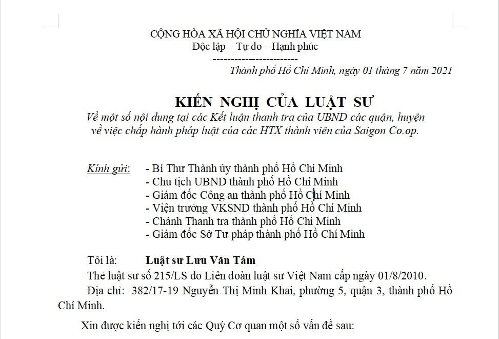 Luật sư đại diện cho hợp tác xã (HTX) thành viên của Saigon Co.op vừa gửi kiến nghị lên lãnh đạo TP Hồ Chí Minh về những bất hợp lý trong việc quy kết sai phạm của các HTX thành viên. Thanh tra cho rằng, việc huy động, góp vốn là sai, có dấu hiệu thâu tóm Saigon co.op. Còn Luật sư lại nói, HTX làm đúng luật, lẽ ra cần được biểu dương.