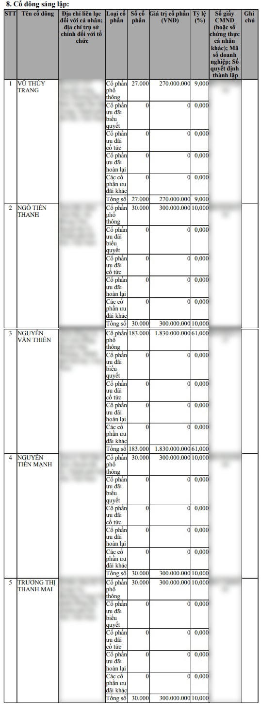 Win Business Academy có vốn điều lệ là 3 tỷ đồng. Cổ đông gồm: Vũ Thuỳ Trang góp 270 triệu, sở hữu 9% cổ phần; Ngô Tiến Thanh, Nguyễn Tiến Mạnh và Trương Thị Thanh Mai mỗi người góp 300 triệu, sở hữu 10% cổ phần/người; Nguyễn Văn Thiên góp 1,83 tỷ đồng, sở hữu 61% cổ phần còn lại.