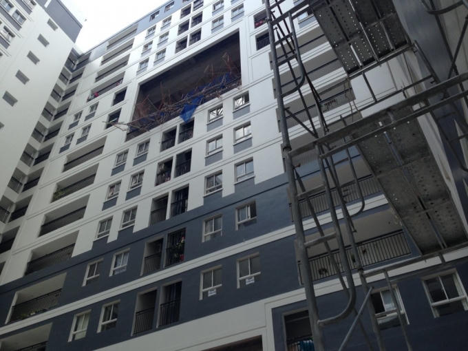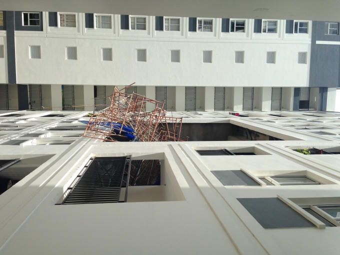 Giàn giáo vẫn đang đươc treo lơ lững phí trên tòa nhà.