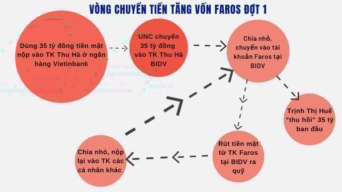 Để tăng vốn, Trịnh Thị Minh Huế chỉ đạo Trịnh Văn Đại, Hoàng Thị Thu Hà, Nguyễn Văn Mạnh ký khống sẵn 14 ủy nhiệm chi với nội dung chuyển tiền góp vốn vào tài khoản của Faros (tổng 223,5 tỷ đồng).