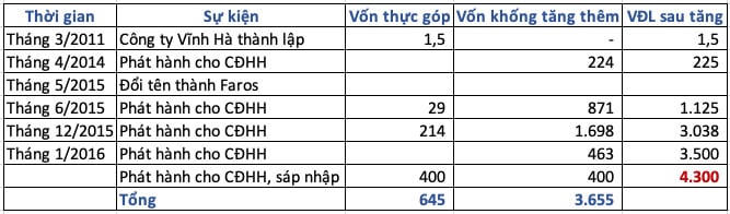 Từ khi bắt đầu đến lúc lên sàn, Faros có 6 lần tăng vốn điều lệ giai đoạn 2012-2016, từ 1,5 tỷ đồng lên 4.300 tỷ đồng. Các đợt tăng vốn của công ty Faros, phần lớn đều xảy ra việc cổ đông không góp thực tiền tăng vốn.