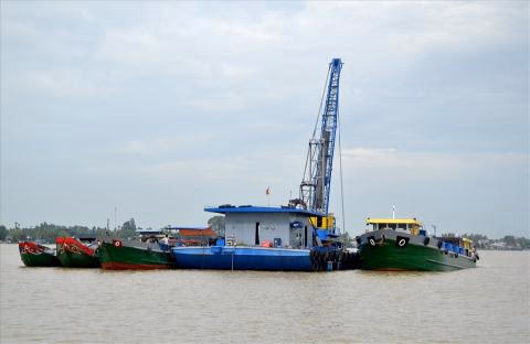 | Khai thác cát trên sông Tiền. Ảnh: Lao động |