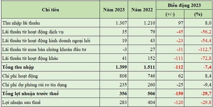 Lãi thuần từ hoạt động dịch vụ đạt 35 tỷ đồng, giảm 56,2% YoY (-45 tỷ đồng); lãi thuần từ hoạt động kinh doanh ngoại hối đạt 19 tỷ đồng, giảm 54,4% YoY (-23 tỷ đồng); lãi thuần từ hoạt động khác đạt 41 tỷ đồng, giảm 72,8% YoY (-112 tỷ đồng).