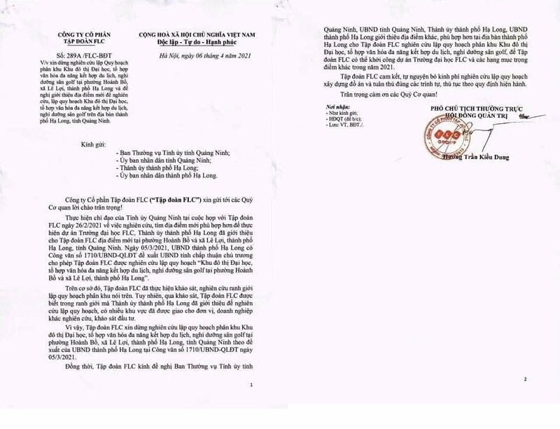 Văn bản Tập đoàn FLC xin dừng nghiên cứu lập Quy hoạch phân khu Khu đô thị Đại học, tổ hợp văn hóa đa năng kết hợp du lịch, nghỉ dưỡng sân golf tại TP Hạ Long.