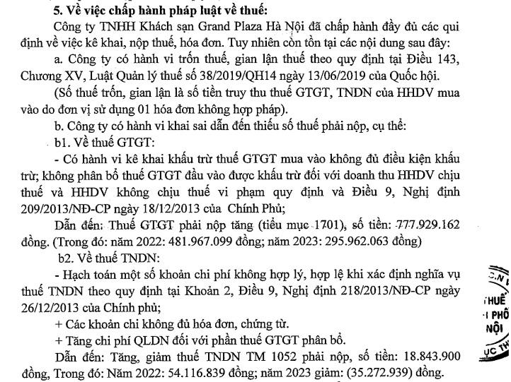 Công ty TNHH khách sạn Grand Plaza Hà Nội được xác định đã có hành vi trốn thuế và gian lận thuế, cùng nhiều vi phạm thuế khác.
