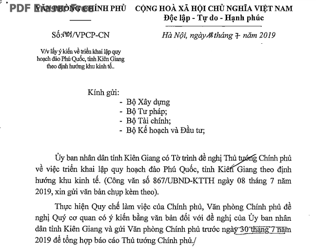 Văn phòng Chính phủ vừa có văn bản lấy ý kiến 4 Bộ về đề nghị dừng quy hoạch đảo Phú Quốc thành đặc khu kinh tế của tỉnh Kiên Giang.