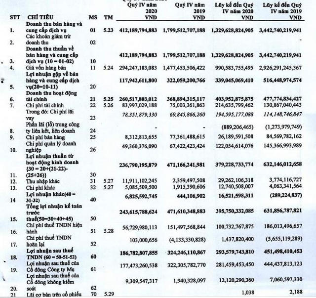 Theo đó, riêng quý IV, doanh thu thuần đạt 302,5 tỷ đồng tăng 57,3% so với cùng kỳ, trong khi giá vốn hàng bán chỉ là 75 tỷ đồng nên lợi nhuận gộp đạt hơn 227 tỷ đồng, tăng 155% so với quý 4/2019. Sau khi trừ các khoản chi phí lợi nhuận sau thuế đạt 144,5 tỷ đồng, cao gấp hơn 4 lần cùng kỳ 2019. Lợi nhuận tăng cao là do tổng doanh thu các hoạt động tăng, đồng thời tổng cho phí giảm 13% so điều chỉnh giá vốn kinh doanh bất động sản kỳ trước.