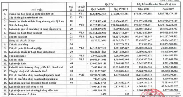 Theo BCTC, quý IV doanh thu thuần của VPI đạt 1.239 tỷ đồng giảm gần một nửa so với cùng kỳ, lợi nhuận gộp đạt 351 tỷ đồng giảm 47,5% so với cùng kỳ 2019. Giải trình trong BCTC ghi rõ, trong quý 4/2020, công ty mẹ tiếp tục ghi nhận doanh thu từ hoạt động chuyển nhượng bất động sản tại dự án The Terra An Hưng, doanh thu từ hoạt động cho thuê căn hộ dịch vụ tại dự án Khu căn hộ dịch vụ khách sạn Hồ Tây và các dịch vụ khác tăng mạnh. Tuy nhiên, do ảnh hưởng bởi biến động thị trường, doanh thu từ chuyển nhượng bất động sản tại các công ty con lại giảm dẫn tới lợi nhuận quý IV/2020 sụt giảm dẫu kết quả này lãi.