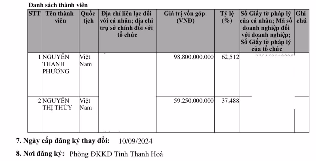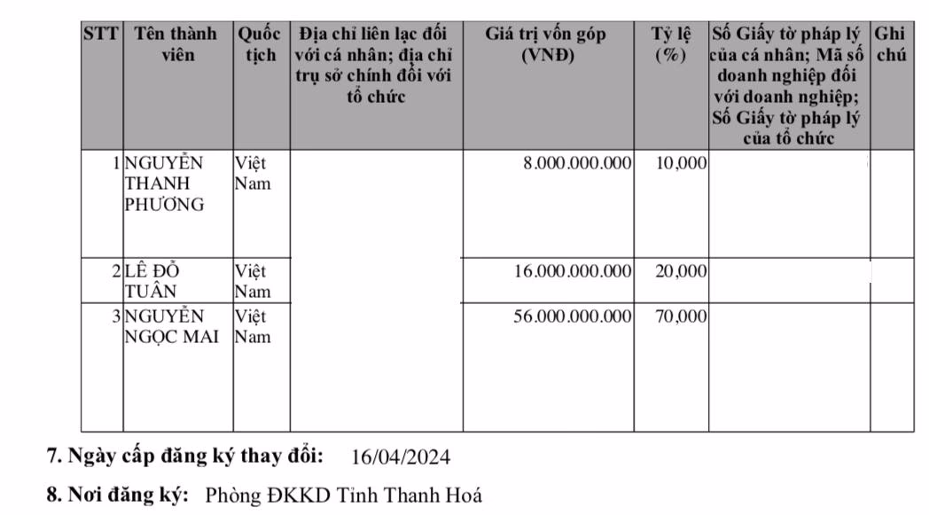 Thành viên góp vốn lúc này gồm có: Nguyễn Thanh Phương góp 8 tỷ đồng (chiếm tỷ lệ 10%); Lê Đỗ Tuân góp 16 tỷ đồng (tỷ lệ 20%) và Nguyễn Ngọc Mai góp 56 tỷ đồng (tỷ lệ 70%).