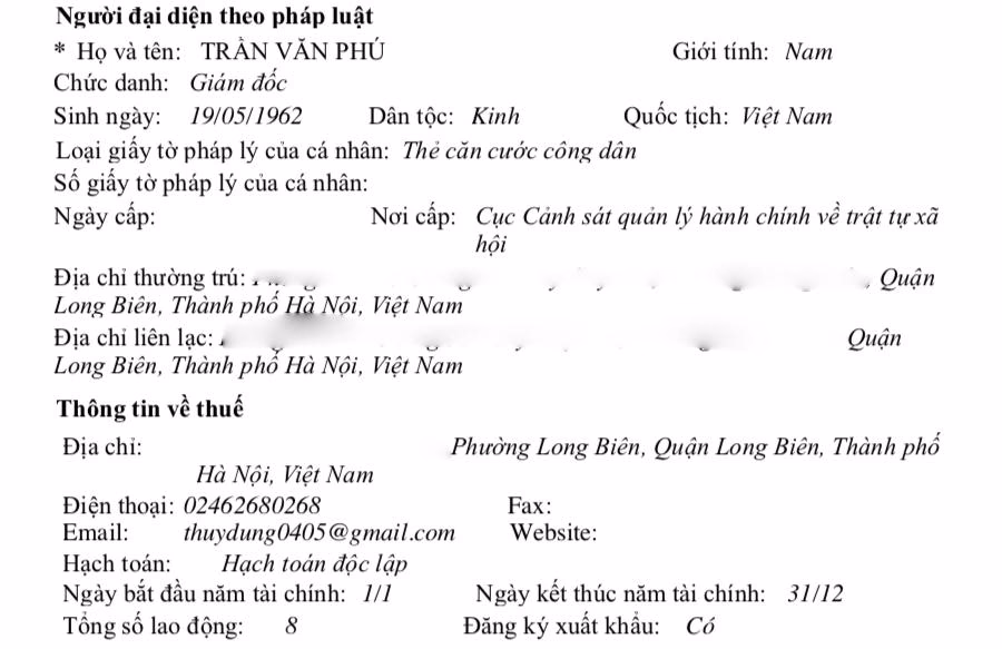 Tháng 12/2022, người đại diện theo pháp luật của công ty được chuyển từ Phạm Thu Trang sang Trần Văn Phú, sinh năm 1962, chức vụ Giám đốc công ty. Tổng số lao động theo đăng ký thuế thời điểm này là 8 người.