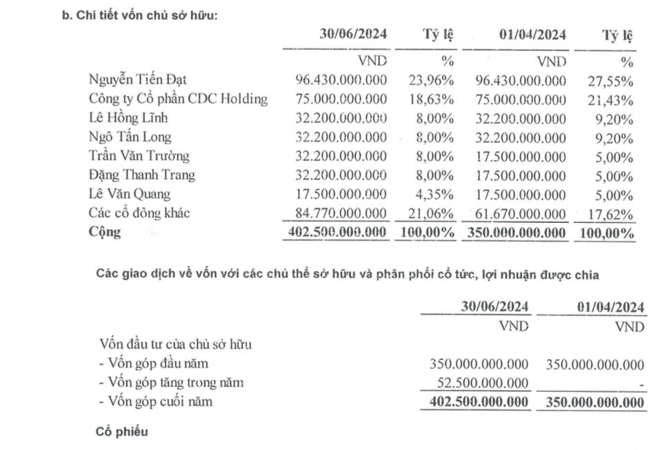 Dữ liệu cho thấy, tại ngày 5/7/2024, Công ty cổ phần Xây dựng CDC có 6 cổ đông lớn, gồm: ông Nguyễn Tiến Đạt sở hữu 23,96% vốn điều lệ; CTCP CDC Holding sở hữu 18,63% vốn điều lệ; ông Lê Hồng Lĩnh sở hữu 8% vốn điều lệ; ông Ngô Tấn Long (Chủ tịch HĐQT) sở hữu 8% vốn điều lệ; bà Đặng Thanh Trang (thành viên HĐQT kiêm Tổng giám đốc) sở hữu 8% vốn điều lệ; ông Trần Văn Trường (Phó Chủ tịch HĐQT) sở hữu 8% vốn điều lệ. Còn lại 25,41% vốn điều lệ thuộc về nhóm cổ đông sở hữu dưới 5% vốn điều lệ.