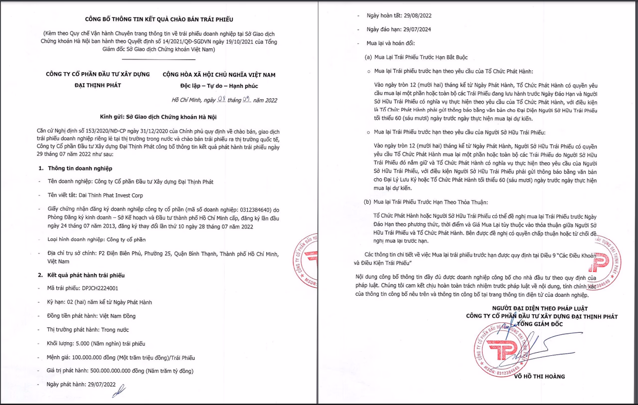 Theo thông tin trên Sở Giao dịch Chứng khoán Hà Nội (HNX), ngày 29/8, CTCP Đầu tư Xây dựng Đại Thịnh Phát vừa huy động thành công lô trái phiếu trị giá 500 tỷ đồng với kỳ hạn 2 năm. Đáo hạn vào ngày 29/7/2024. Các thông tin về lãi suất, trái chủ và bên đứng ra thu xếp thương vụ hay tài sản đảm bảo không được công bố.