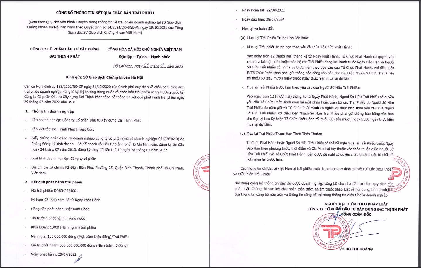 CTCP Đầu tư Xây dựng Đại Thịnh Phát vừa huy động thành công lô trái phiếu trị giá 500 tỷ đồng với kỳ hạn 2 năm. Đáo hạn vào ngày 29/7/2024. Đại Thịnh Phát được biết đến là chủ đầu tư dự án Marina Tower Bình Dương.