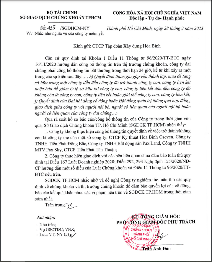 Cụ thể, văn bản nêu rõ, qua rà soát hồ sơ báo cáo/công bố thông tin của Xây dựng Hòa Bình trong thời gian vừa qua, HOSE nhận thấy Xây dựng Hòa Bình không thực hiện công bố thông tin quyết định về việc trở thành/không còn là công ty mẹ của một số công ty: CTCP Kỹ thuật Hòa Bình Oseven, Công ty TNHH Tiến Phát Đông Bắc, Công ty TNHH Bất động sản Pax Land, Công ty TNHH MTV Pax Sky, CTCP Tiến Phát Tân Thuận.