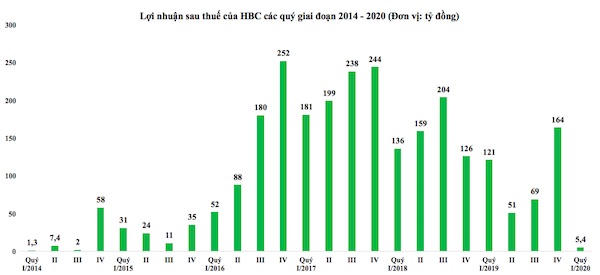 Quý I/2020 Tập đoàn Xây dựng Hoà Bình ghi nhận mức lợi nhuận thấp nhất 5 năm trở lại đây và nếu không nhờ khoản lợi nhuận khác thì Tập đoàn đã báo lỗ trong quý I.