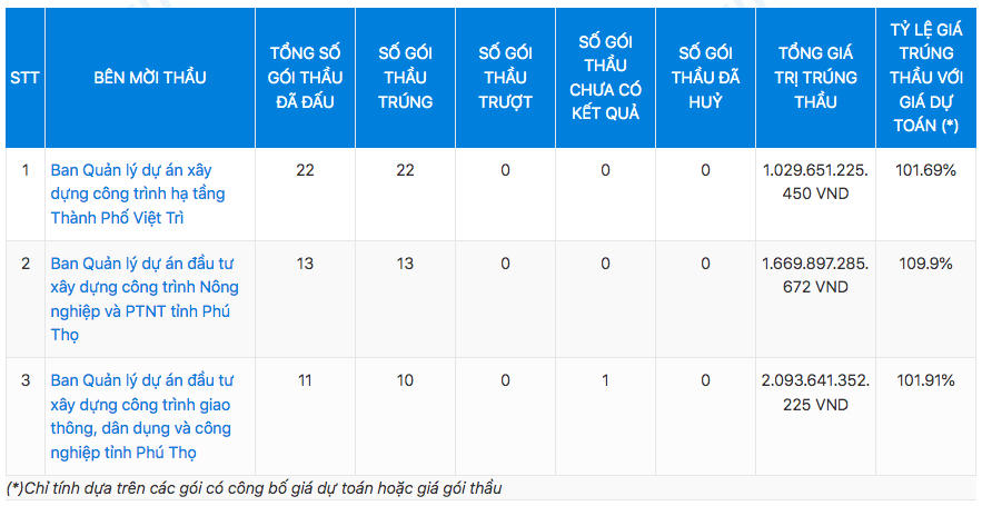 Thống kê sơ bộ cho thấy, Xây dựng Tự Lập là nhà thầu khá “quen thuộc” tại Ban QLDA xây dựng công trình hạ tầng thành Phố Việt Trì, khi đã tham gia và trúng 22/22 gói thầu do đơn vị này làm chủ đầu tư, tổng giá trị trúng thầu lên đến 1.029 tỷ đồng.