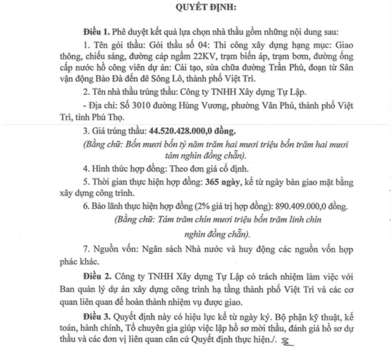 Trước đó, vào tháng 6/2023, Xây dựng Tự Lập trúng Gói thầu số 06 Thi công xây dựng công trình, thuộc dự án Đường Mai An Tiêm (đoạn từ Kênh tiêu Đông Nam đến đường Âu Cơ), thành phố Việt Trì với giá trúng thầu hơn 48,83 tỷ đồng, giá dự toán gói thầu hơn 49 tỷ đồng.
