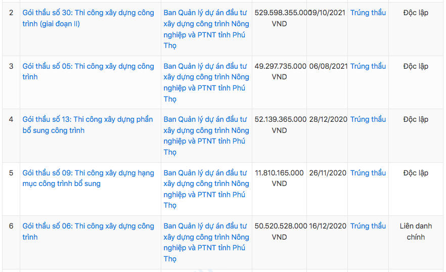 Dữ liệu của VietnamFinance còn thể hiện, Xây dựng Tự Lập cũng là khách quen tại các gói thầu do Ban QLDA đầu tư xây dựng công trình Nông nghiệp và PTNT tỉnh Phú Thọ làm bên mời thầu khi trúng tới 13 gói thầu với tổng giá trị trúng thầu hơn 1.669,89 tỷ đồng.