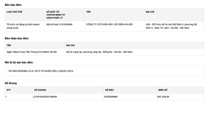 Tháng 9/2023, Công ty cổ phần Xây lắp điện Hà Nội 1 xe ô tô Lexus LX 570 mang biển số 30E-33899 và 1 xe sơ mi rơ mooc, 1 xe ô tô đầu kéo có biển số lần lượt là 29R-51410 và 29G-01127 làm tài sản bảo đảm.
