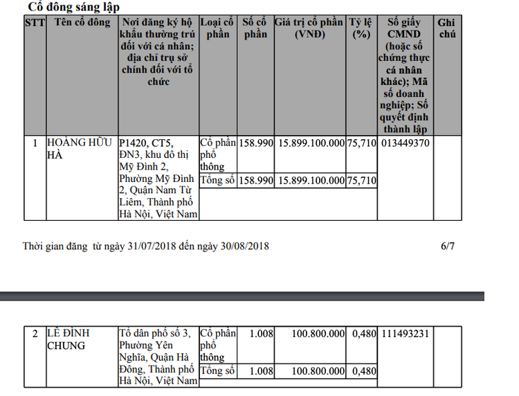 Được thành lập vào tháng 4/2005, Công ty cổ phần Xây lắp điện Hà Nội có 2 cổ đông chính là ông Hoàng Hữu Hà góp 15,9 tỷ đồng và nắm giữ 75,714% cổ phần; ông Lê Đình Chung góp 100 triệu đồng, nắm giữ 0,476% cổ phần. Cuối tháng 7/2018, số lượng vốn góp và cổ phần của 2 cổ đông có chút thay đổi nhỏ.