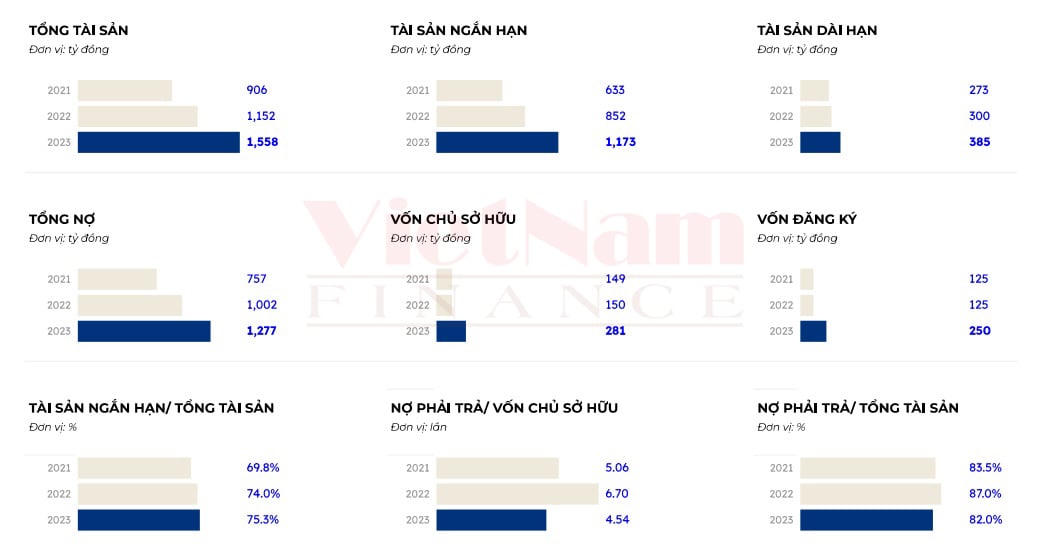 Tài trợ chính cho nguồn vốn của Xây lắp Hải Long là các khoản nợ. Cụ thể, nợ phải trả trả của doanh nghiệp này vào năm 2021 là 756,7 tỷ đồng (chiếm 83,5% nguồn vốn); năm 2022 là 1.002,2 tỷ đồng (chiếm 87% nguồn vốn); năm 2023 là 1.276,7 tỷ đồng (chiếm 82% nguồn vốn).