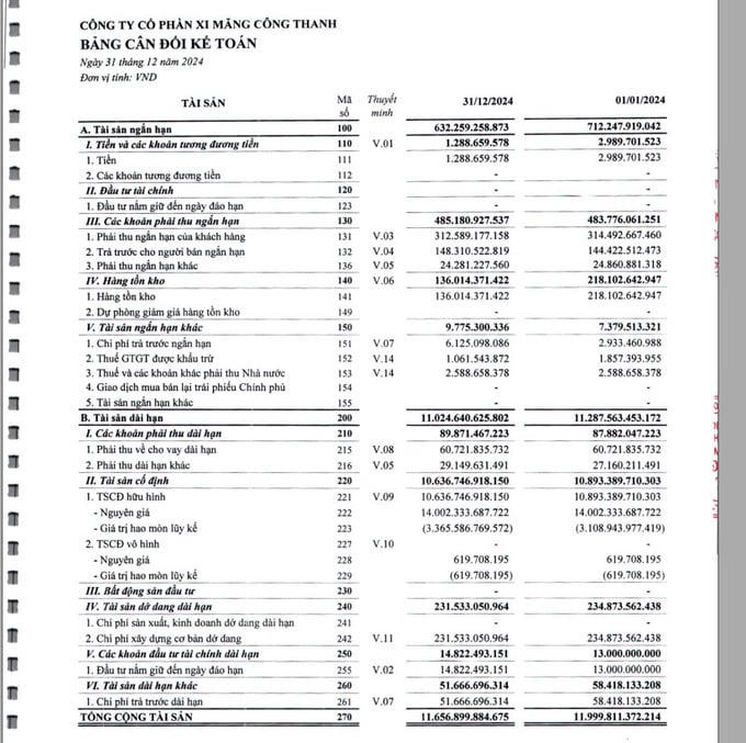 Xem xét chi tiết hơn, cơ cấu tài sản của Xi măng Công Thanh năm 2024 cho thấy tài sản cố định hữu hình (giá trị còn lại 10.637 tỷ đồng) chiếm tỷ trọng lớn (gần 91%). Tài sản ngắn hạn chiếm khoảng 5,4%, trong đó tiền mặt và các khoản tiền gửi có kỳ hạn chiếm tỷ lệ nhỏ. Hàng tồn kho giảm xuống còn 136 tỷ đồng và phần lớn được dùng làm tài sản thế chấp cho các khoản vay.