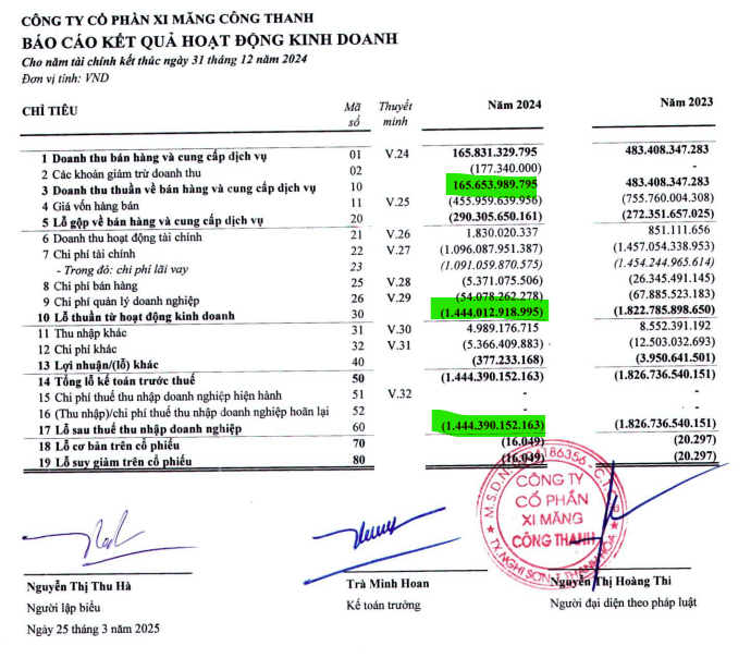 Thứ nhất, tại thời điểm cuối năm 2024, Xi măng Công Thanh đã phát sinh khoản lỗ trước thuế 1.444 tỷ đồng, cùng kỳ lỗ 1.827 tỷ đồng. Trong khi đó, doanh thuần đạt 165 tỷ đồng, giảm 66% so với năm ngoái.