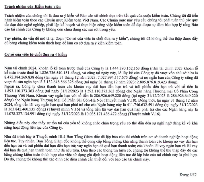 Dựa theo các thông tin hiện có, đơn vị kiểm toán chưa thể thu thập đầy đủ các bằng chứng kiểm toán thích hợp cho việc sử dụng giả định hoạt động liên tục để soạn lập BCTC này là phù hợp. Do đó, kiểm toán từ chối đưa ra ý kiến về BCTC năm 2024 của Xi măng Công Thanh.