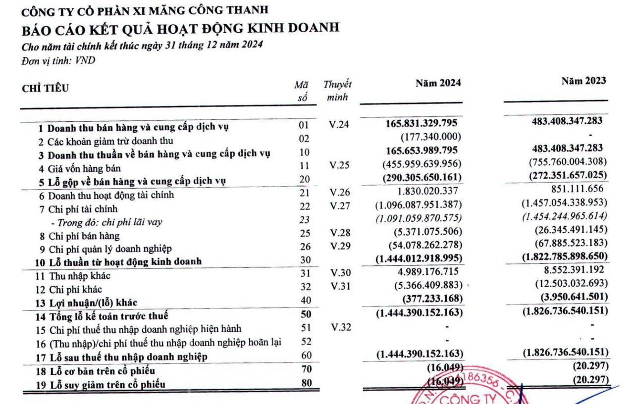 Trừ đi các khoản chi phí tài chính, chi phí bán hàng, chi phí quản lý doanh nghiệp hơn nghìn tỷ đồng, Xi măng Công Thanh báo lỗ hơn 1.444 tỷ đồng cho cả năm 2024, kéo dài xu hướng thua lỗ đã được công ty bắt đầu từ nhiều năm trước.